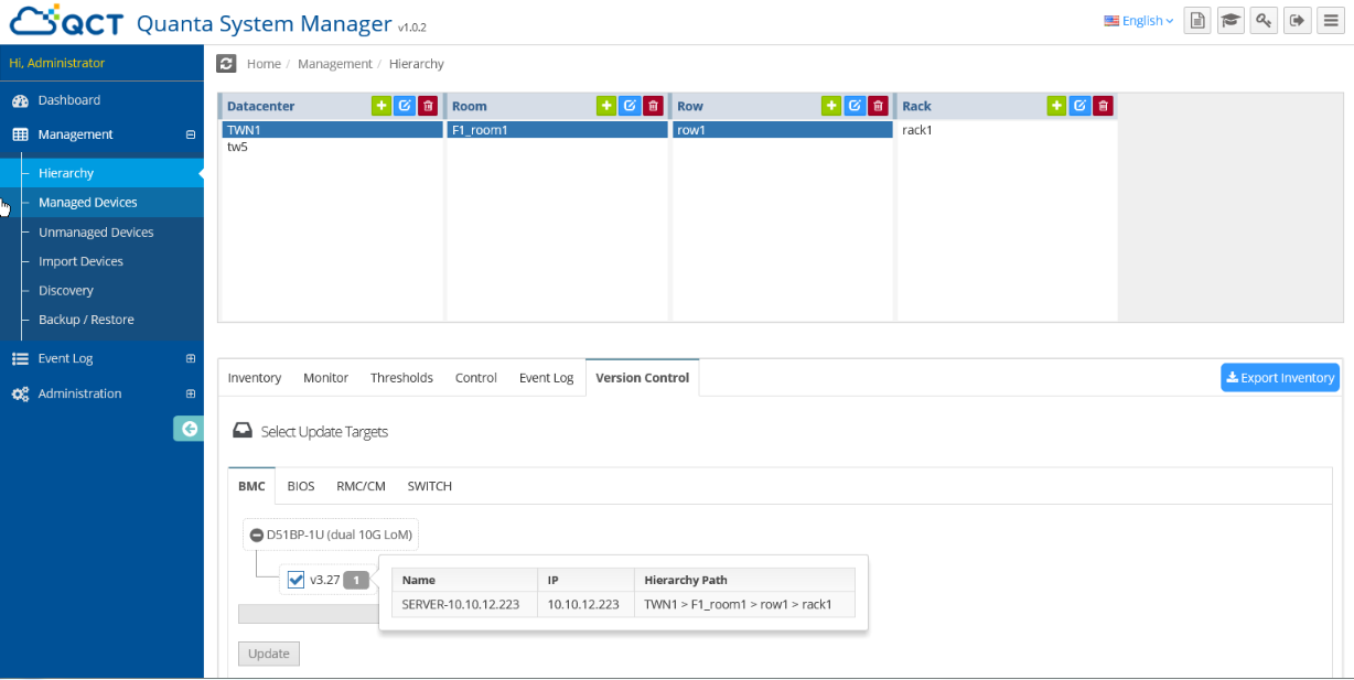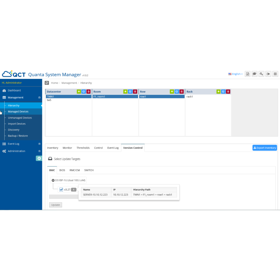 With a hierarchical structure view, Quanta System Manager helps administrators find out a specific system and identify where it located in datacenter easily. This design improves IT administrator working efficiency by converging management of server and networking devices.